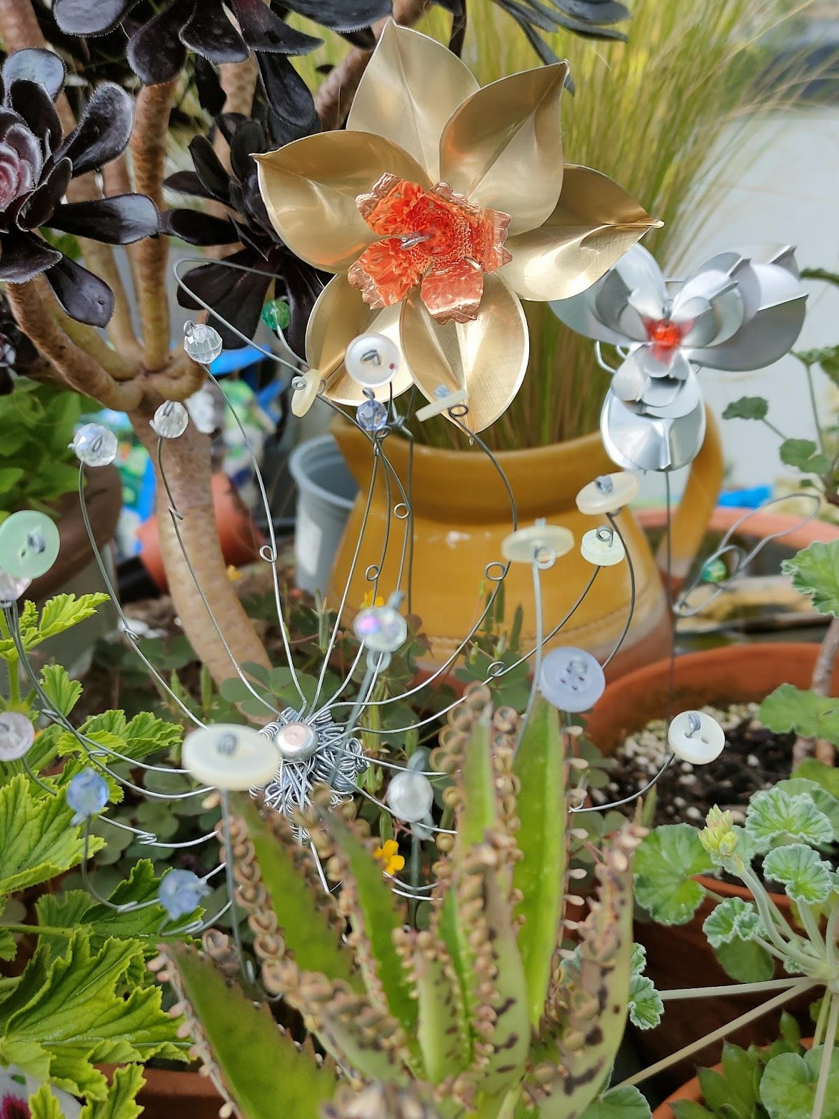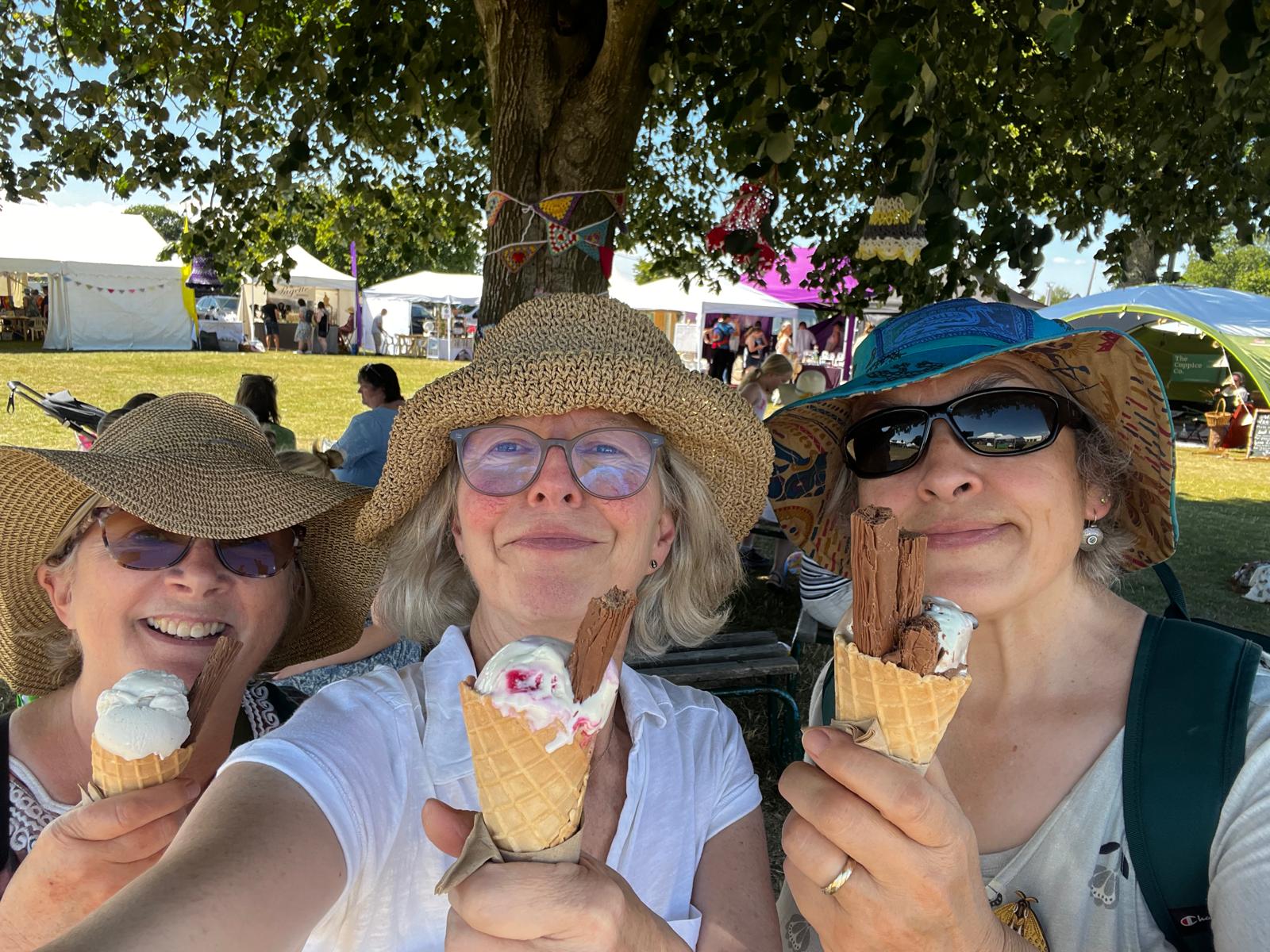 fabulous metallic flowers from drinks cans and seed heads repurposing a knitting needle in the centre with wonderful wirework including buttons and beads.  We all bought something from her. Before heading home we enjoyed delicious ice creams from the Bay Ice Cream van. There will be a Christmas Festival 6/7 December which is tempting, and the dates for 2026 are already on the website, so hopefully we’ll be back next year. Most of all we all had a fun and enjoyable day: many thanks to Elaine for organising and Jennie for being our chauffeur.