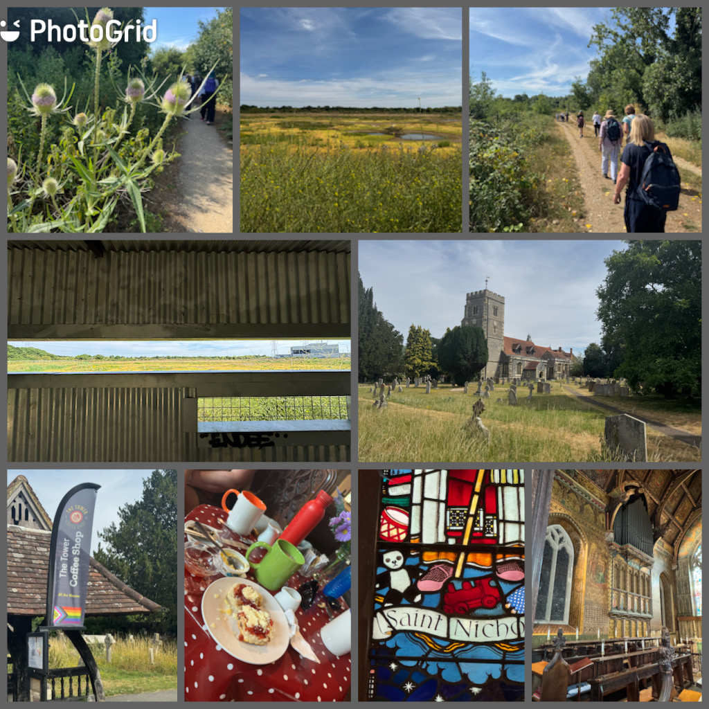 Eleven of us and three dogs turned out on a sunny morning for a fifteen-minute train ride down to Mitcham Junction, where the Wandle Valley’s Beddington Farmlands Nature Reserve is right next to the station. Created from old farmland and a former sewage facility, it’s become a haven for birds, insects and plantlife but remains largely inaccessible to humans. We followed the one permissive earth path right through it, visiting a birdwatchers’ hide but almost nobody else until emerged into the more manicured grounds of Beddington Park. Here we enjoyed visiting the pretty Grange and Memorial gardens before pausing for coffee at a little café enterprisingly established by parishioners within  St Mary’s Church. After that we walked up past Tudor Carew Manor (now a school) and its big Georgian dovecot to join the Wandle Trail, following it upstream as far as Waddon Ponds.